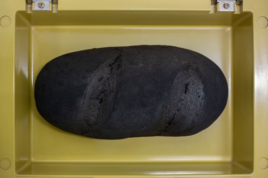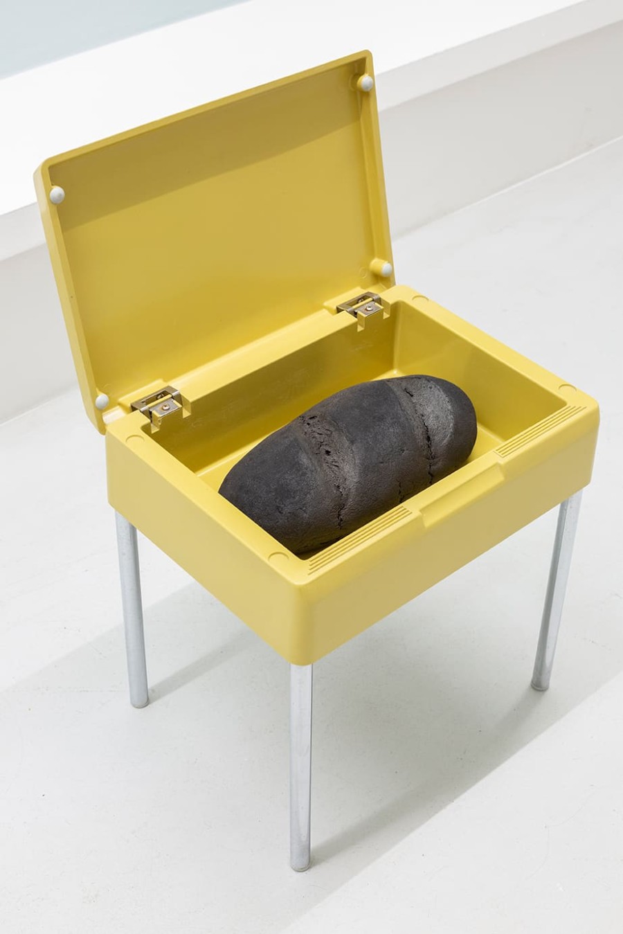 In ihren Selbstporträts zeigt sich Engelmann versteinert, ohnmächtig, verletzlich, aber nicht versöhnt. Neben ihr liegt die geerntete Herbstzeitlose, eine invasive Pflanze, deren Wirkstoff Colchicin die Zellteilung blockiert und das Wachstum anderer Pflanzen unterdrückt. Wiederholt erscheint in ihren Arbeiten das verkohlte Brot – einmal skulptural, archiviert oder als Brotkopf. Diese Geste der Veräscherung verweist auf Methoden der ethnobotanischen Forschung, in der Pflanzen zur Analyse und Konservierung verbrannt werden. Engelmann nutzt diesen Akt als Symbol für Transformation, Erinnerung und Wissensspeicherung.