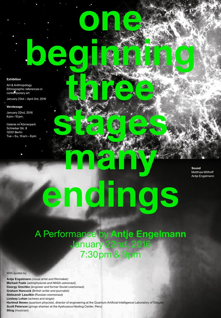 Im Soundstück »One Beginning, three Stages and many Endings« werden von Engelmann Interviews, Found Footage-Materialien und eigenen Aufzeichnungen dicht montiert. Die verwendeten Text- und Audiofragmente entstammen einem für das Amazonasgebiet typischen Ayahuasca Ritual. Ausgehend von ihrer eigenen halluzinogenen Erfahrung mit der Anwendung und Aneignung des Ayahuasca Tees beschäftigt sich Engelmann mit dem Hype dieses bewusstseinserweiternden Gebräus im globalisierten, psychologisierten, »westlichen« und wissenschaftlichen Kontext. Dabei geht es ihr nicht darum, das ursprüngliche Ritual der indigenen Gruppen zu verstehen, sondern, inspiriert von der amerikanischen Soziologin Carolyn Ellis, um das Reflektions- Potential autoethnografischer Verfahren. Den sprachlichen Versuch diese subjektive Erfahrung in unseren Wissenskanon einzuordnen, überspitzt Engelmann mittels musikalischer Popelemente und sphärischer, maschinell erstellter Klänge.