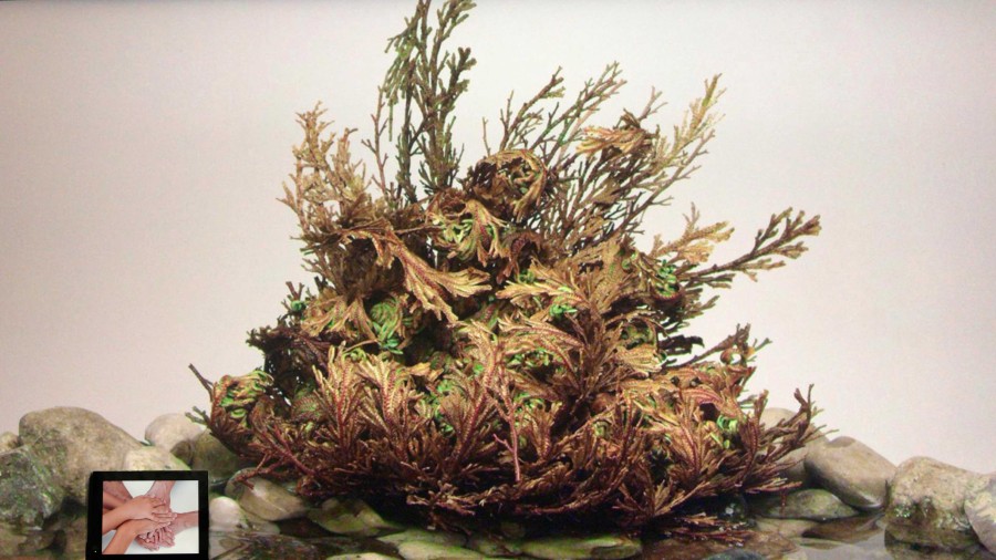 Die Rose von Jericho, die sich im Raum, unmerklich in einer großformatigen Projektion öffnet, kann jahrhundertelange Dürre überstehen. Als transnationale Spezies überschreitet sie politisch, nationale Grenzen (wie der Monarchfalter) und steht für regenerative, atmende Zeitmodelle.