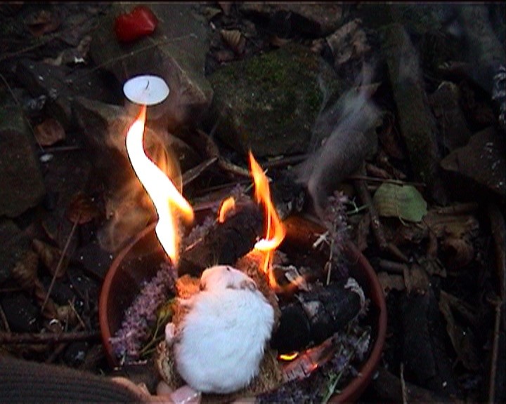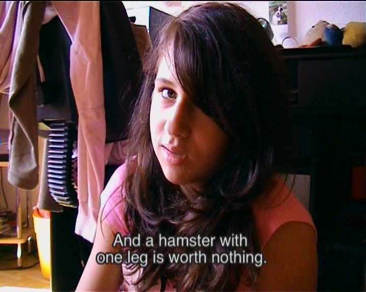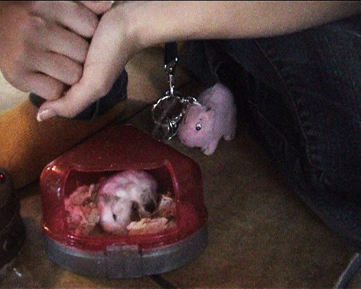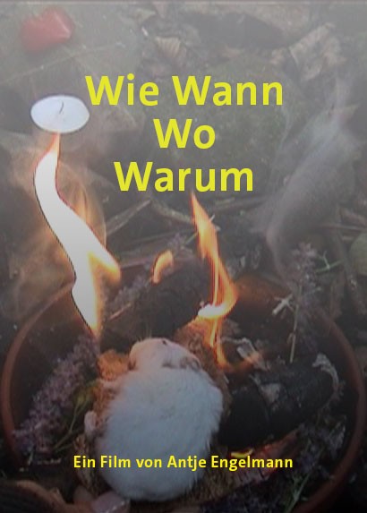 »Wie Wann Wo Warum« behandelt den Tod des Hamsters Rufus und dessen Verarbeitung durch die 12-jährige Schwester der Künstlerin, Laurin. Was anfangs wie eine filmische Beobachtung anmutet, erweist sich auf den zweiten Blick als Möglichkeit, die Trauerarbeit der Schwester aktiv zu begleiten. Ausgehend von der Nachricht, dass das Tier eingeschläfert werden muss, entwickelt Antje Engelmann ein Einäscherungsritual für den toten Hamster: An einer einsamen Stelle im Wald baut sie mit Laurin einen kleinen Altar auf und beobachtet den in Flammen aufgehenden Kadaver des Haustiers. Das Ritual lässt die Darsteller verstummen und ermöglicht dem Zuschauer ein Nachdenken über die Macht symbolischer Handlungen. Solchen Fragen nach dem Sinn von Ritus und Symbolik geht Engelmann auch in ihrem neuesten Film ausführlich nach.